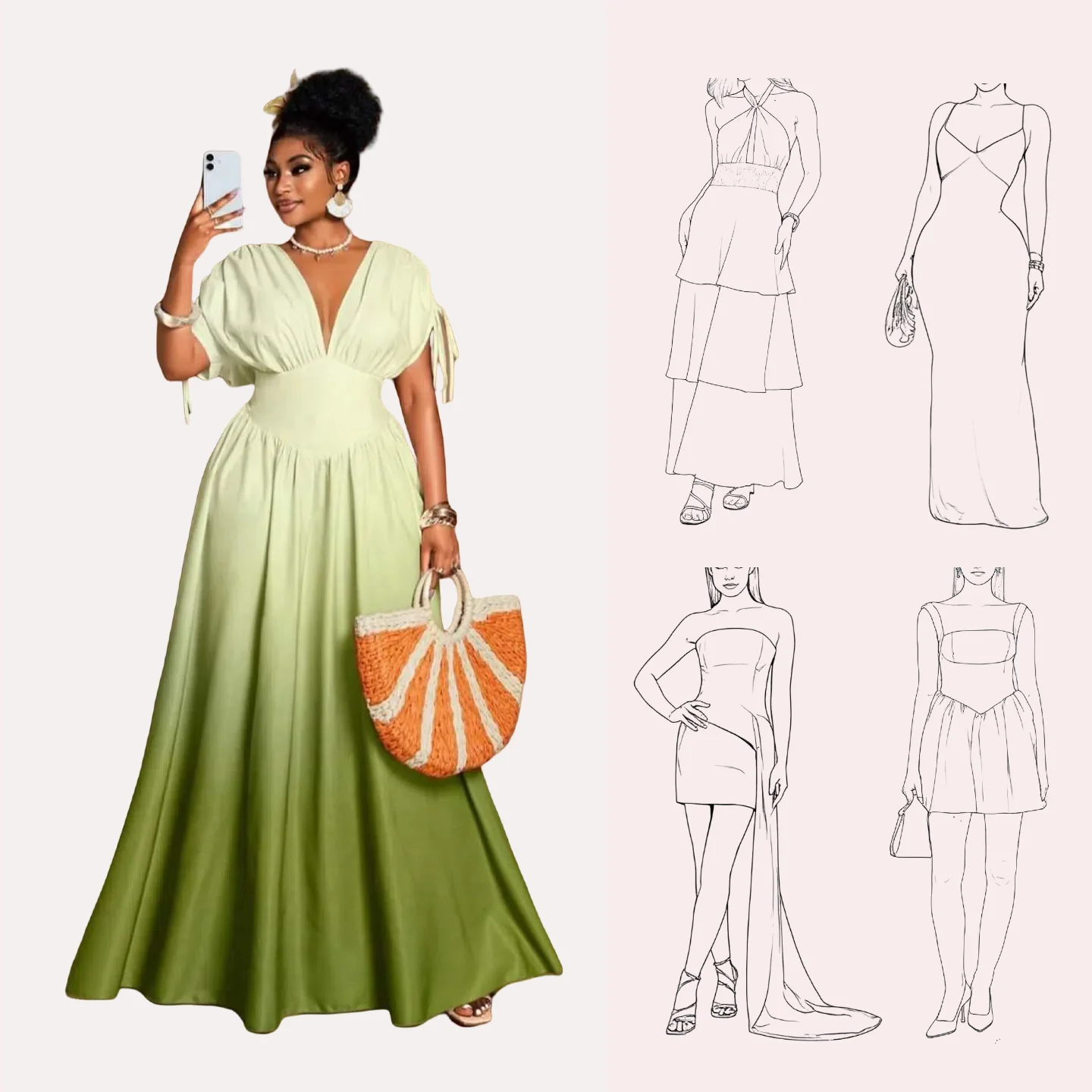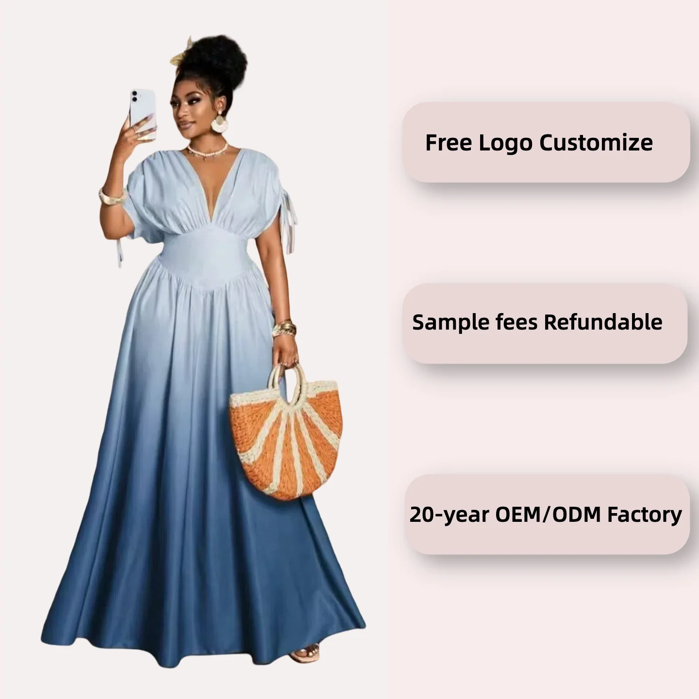 Women's Customizable Maxi Dress with Gradient Print Short Sleeve Drawstring Shoulder Detail V-Neck for Summer Vacation